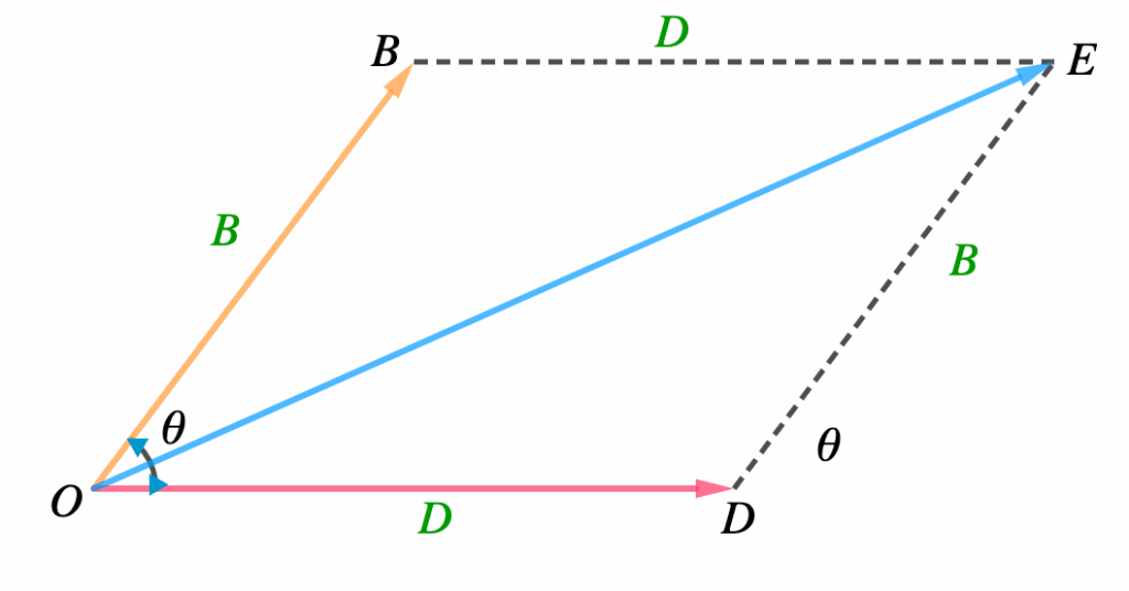 Let θ be the angle between B and D and R be the resultant vector. Then, according to parallelogram law of vector addition, diagonal OE represents the resultant of B and D .